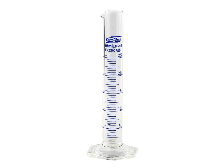 Cylinder miarowy szklany 25 ml skala niebieska