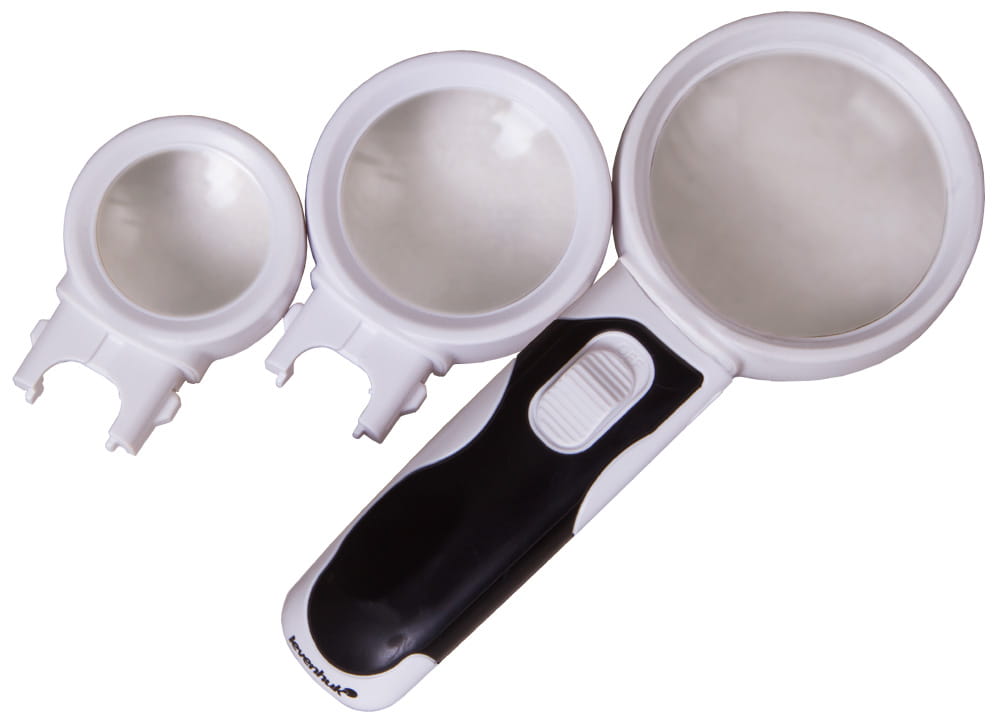 Modele z trzema wymiennymi soczewkami o różnym stopniu powiększenia i różnej średnicy montuje się w ergonomicznym uchwycie za pomocą prostego zapięcia. Soczewka o dużym powiększeniu służy do badania małych obiektów, a soczewka o małym powiększeniu – do czytania. Oświetlenie LED jest zamontowane w uchwycie. Równomiernie oświetla całą powierzchnię roboczą pod soczewką.