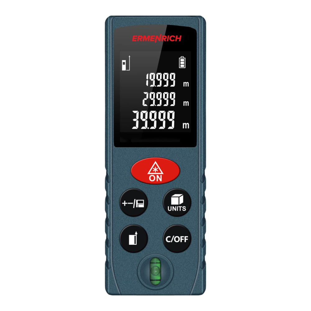 Miernik laserowy Ermenrich Reel GK100 ma szeroki zakres funkcji niezbędny do większości prac budowlanych, remontowych i różnych prac domowych. Umożliwia pomiar odległości, powierzchni i objętości. Funkcja wykorzystująca twierdzenie Pitagorasa jest przydatna, jeśli niemożliwe jest wykonanie pomiarów w zwykły sposób: wykonując dwa pomiary pośrednie, można uzyskać odległość do żądanego punktu. Wbudowana poziomica pęcherzykowa.