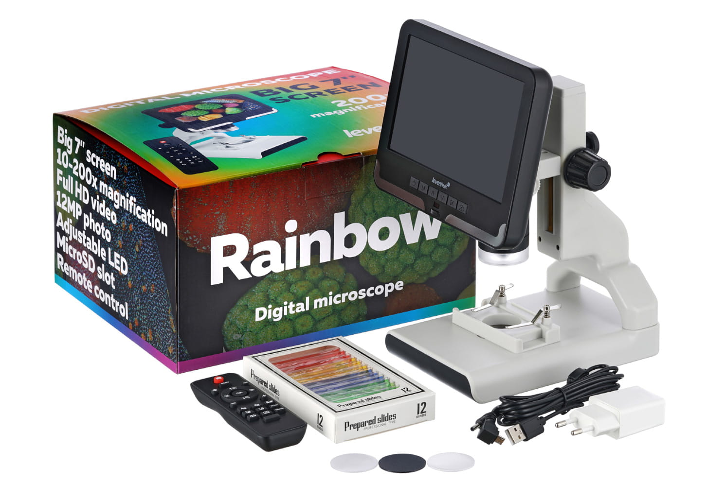 Levenhuk Rainbow DM700 LCD to mikroskop cyfrowy z dużym wyświetlaczem LCD. Ten mikroskop może być używany do obserwacji tekstyliów, owadów, monet i banknotów, preparatów roślinnych, a także urządzeń i elektroniki. Mikroskop pozwala na nagrywanie filmów i robienie zdjęć w wysokiej rozdzielczości i można go obsługiwać bezprzewodowym pilotem.
