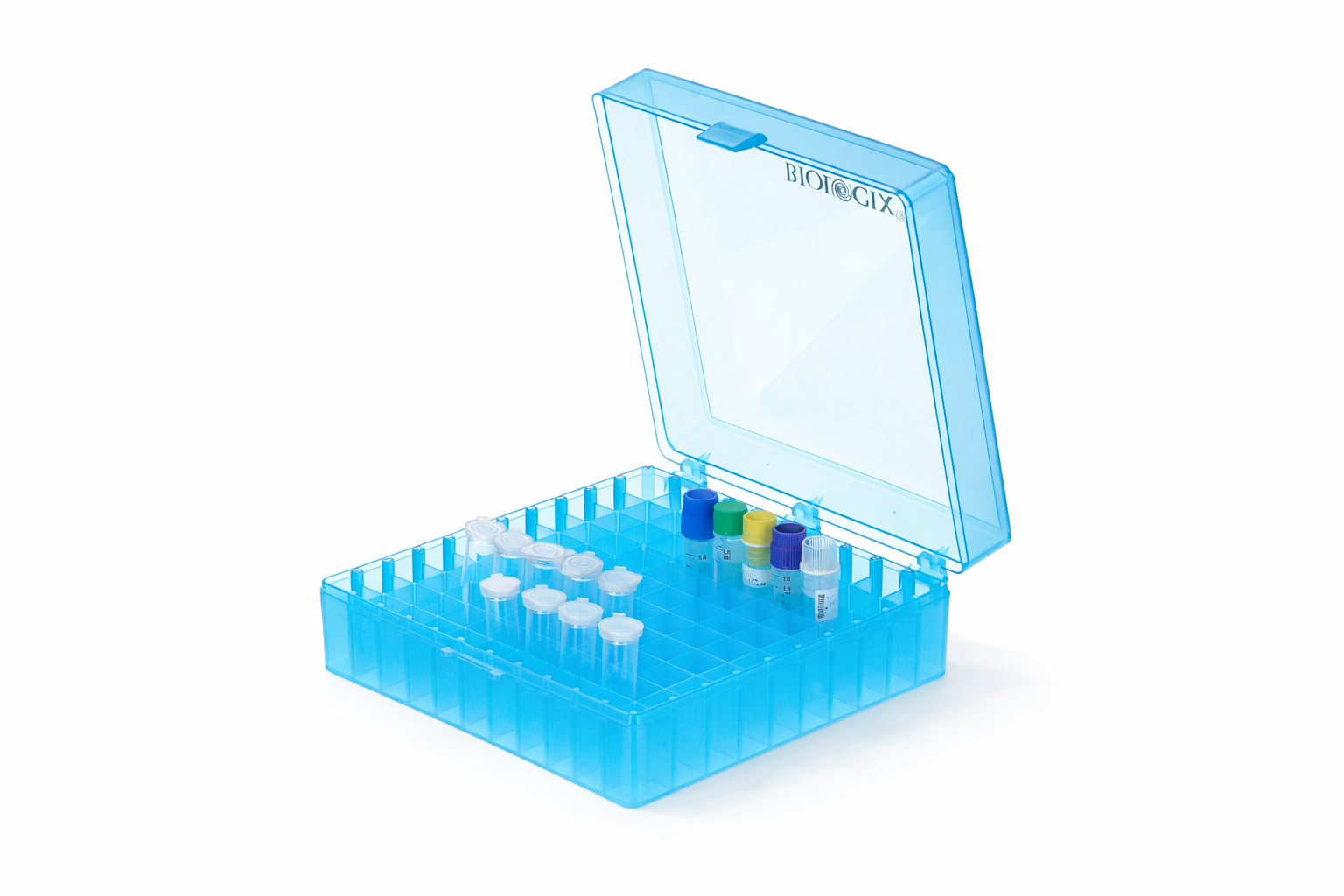 Pudełko PP na probówki 100 miejsc, h 54 mm, niebieskie - BIOLOGIX