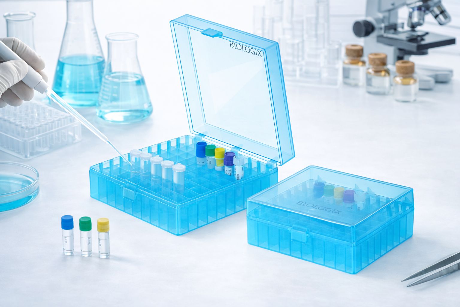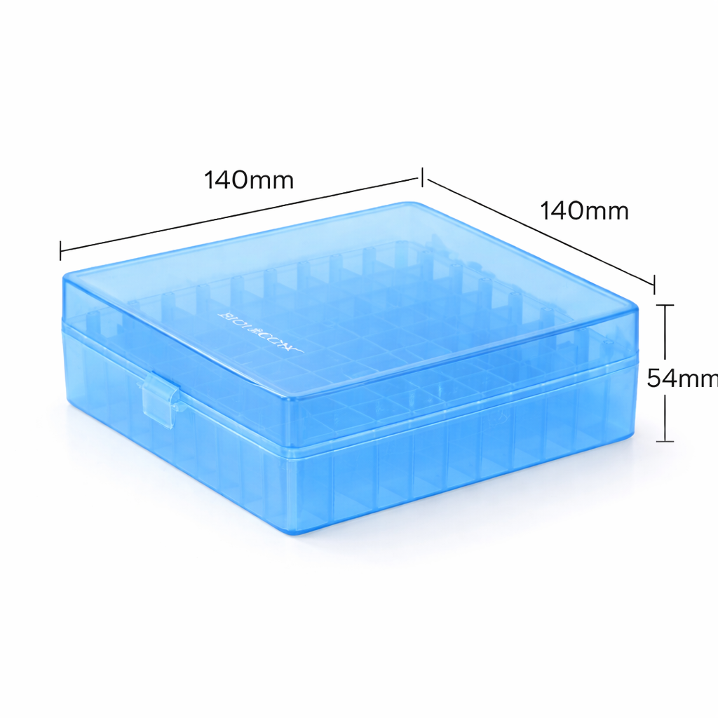 Pudełko PP na probówki z 100 miejscami jest wszechstronnym narzędziem w pracy laboratoryjnej. W laboratoriach biologicznych i medycznych umożliwia systematyczne magazynowanie próbek krwi, ekstraktów DNA czy innych materiałów biologicznych, co jest kluczowe dla zachowania spójności procesu badawczego. Intuicyjna organizacja próbek przy alfanumerycznych oznaczeniach usprawnia identyfikację i minimalizuje ryzyko pomyłek przy analizie licznych danych.
